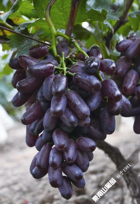 3、東方指葡萄苗:有核鮮食葡萄,果穗較大,平均重穗650克,粒重11-14克,果粒細長型,每個果粒含種子1-2粒,先端紫紅色,光亮,基部稍淡,比美人指著色好,粒長、大,外觀更漂亮,果肉爽脆,有清香味,味甜爽口,果粒頂部含糖量最高可達23度,果粒基部含糖量可達19度。抗病、豐產、易種、極早熟。在陜西地區七月下旬成熟。